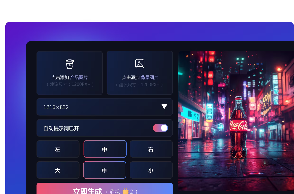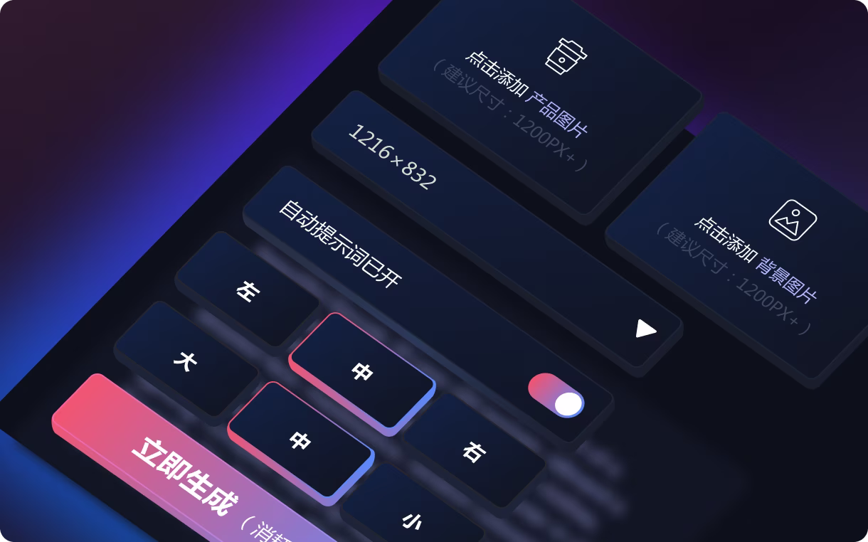 您可以选择适合的长宽比,自定义背景生成提示词,自定义产品位置和大小……敬请期待更多选项!
